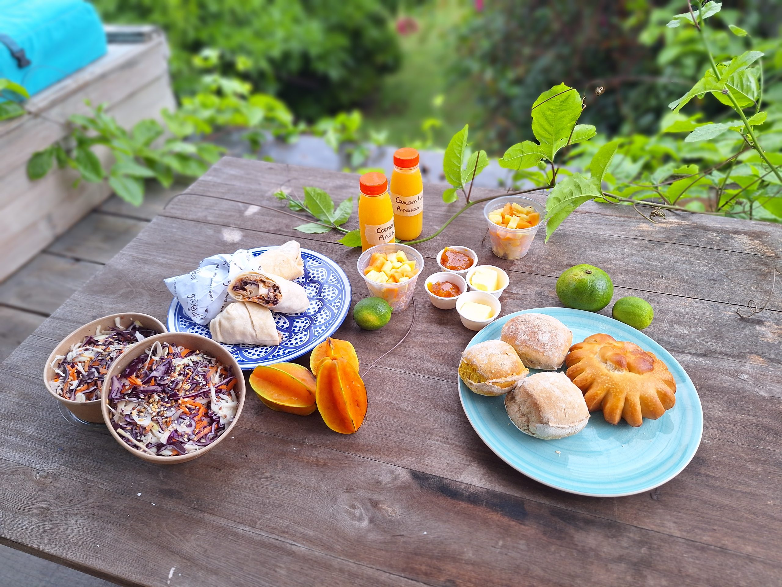 Jus de fruits frais (25cl), Tartare de fruits frais, Pomme cannelle (brioche locale), pain, confiture locale, beurre doux et beurre salé, wrap au poulet ou chiquetaille de morue ou végétarien ou jambon, salade fraîche vinaigrette exotique.